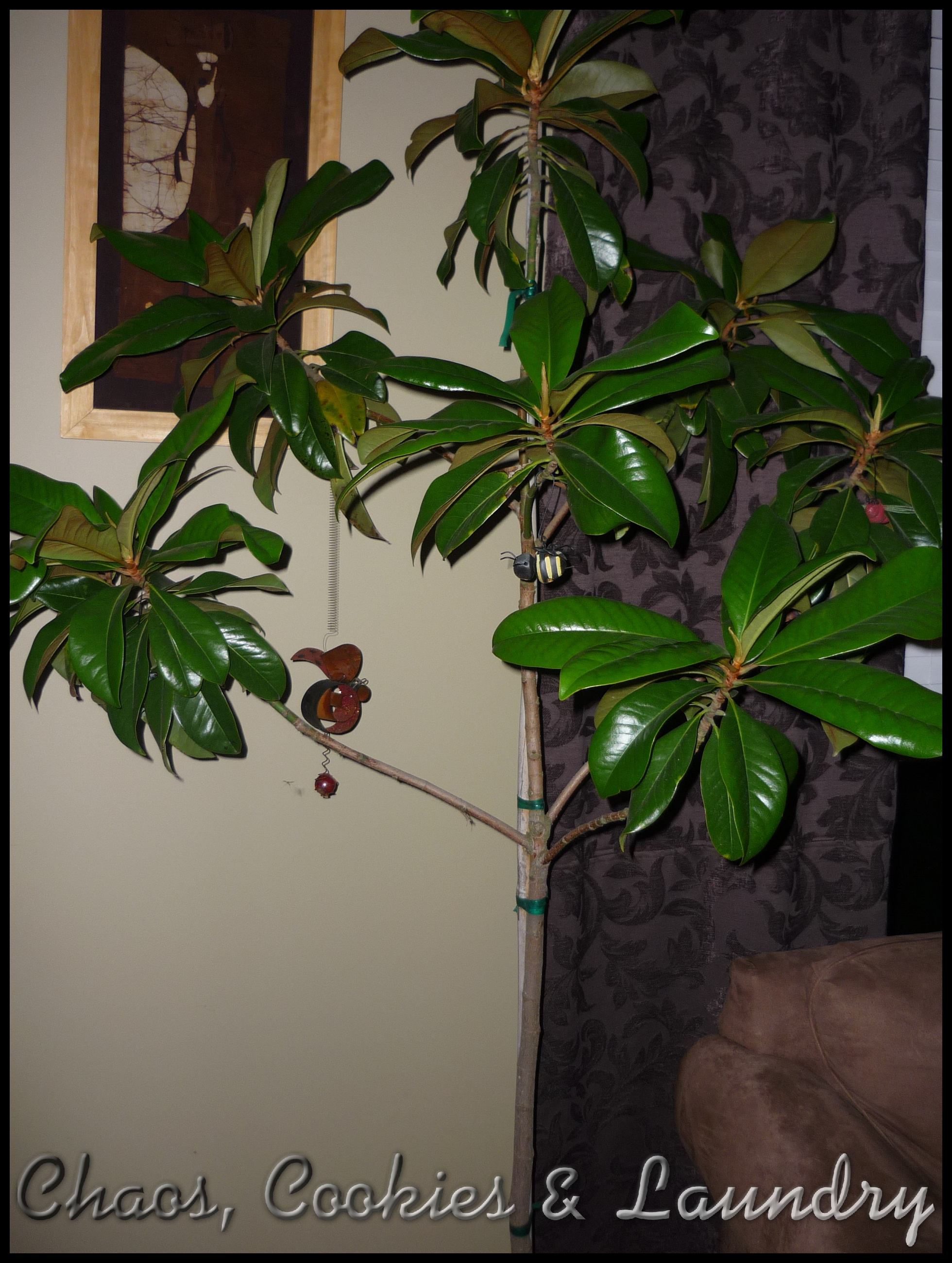 This past year for my birthday a friend of mine gave me a Magnolia Tree. She told me it was root bound and needed some TLC. So when I got it home I put it in a big pot with some great soil and TLC’ed it all summer long. It was looking so good with new shiny leaves. When the cold hit I just didn’t have the heart to let it stay out there and freeze. So, while my husband was tired and in a moment of weakness, I asked him to bring it in. What looked like a small tree outside is now a rather large house plant.