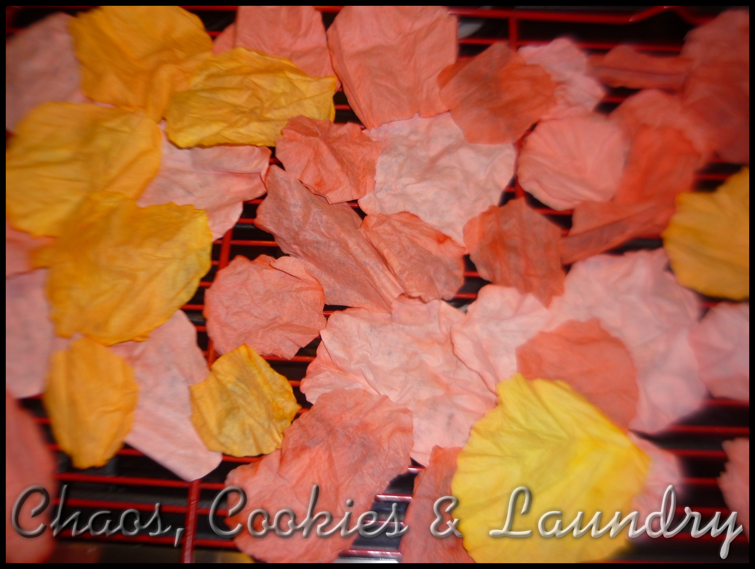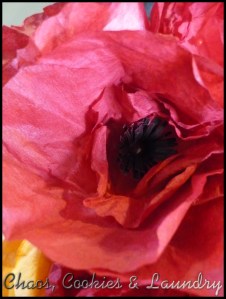 First I found the template for the poppy petals on this website and traced them on to the coffee filters.  Once they were cut out I crumpled them and put them in the water mixed with food colouring. Afterwards I dried them on a rack.