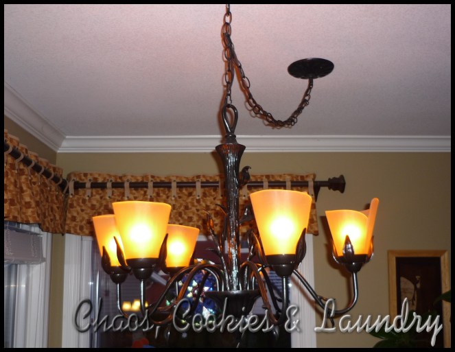 Once it was dry, Mr. Chaos re-wired the whole thing.  Then it was finally time to put it all back together and hang it up.  Now rather than a plain old pot light above my table, there is a beautifule Calla Lilly chandelier.