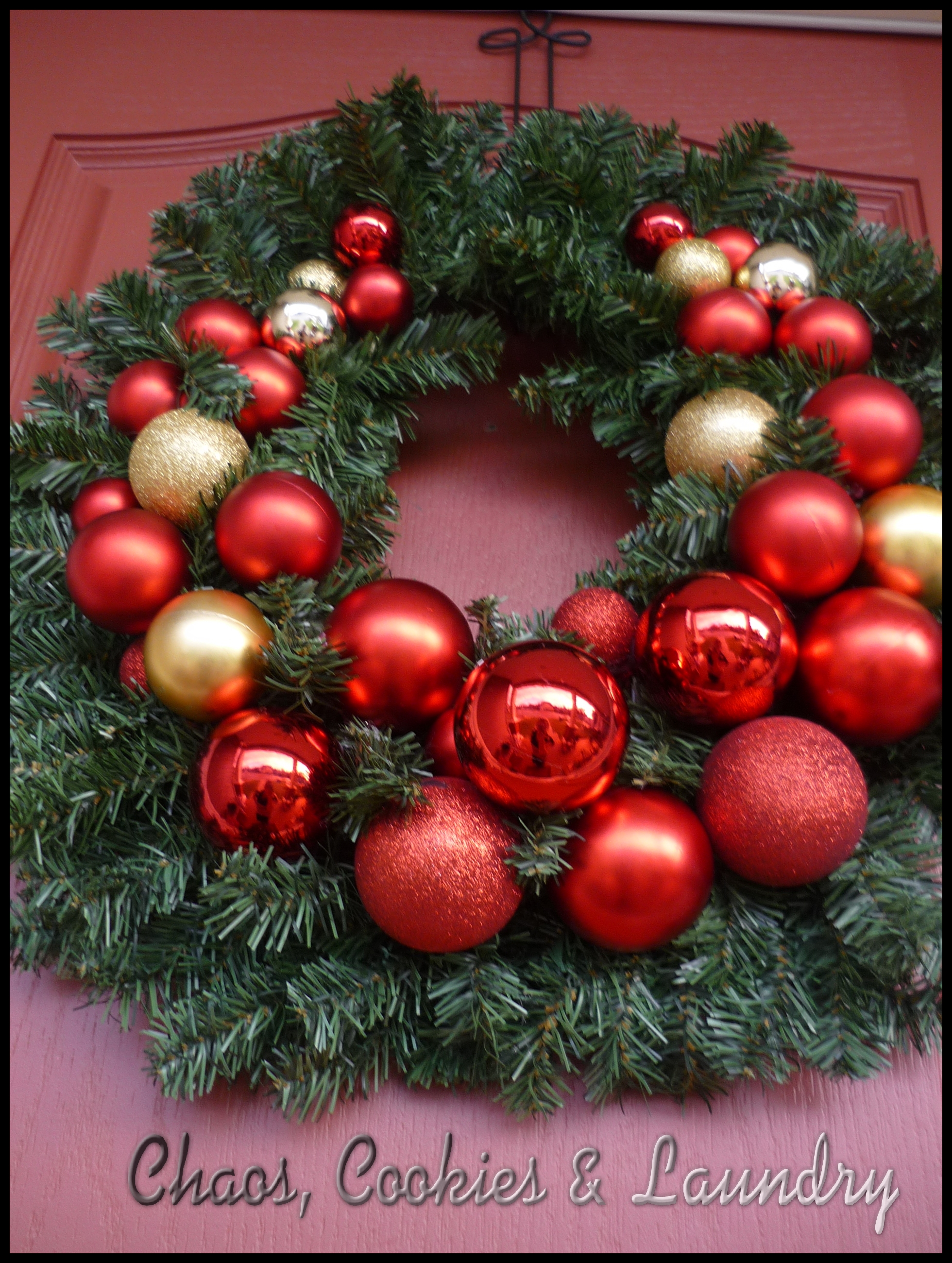 secure. Then I took a pre-made wreath with just greenery on it. First I placed all the balls on the wreath it to determine the layout I wanted. Than I started attaching the bigger balls on the bottom and worked my way up both side simultaneously.