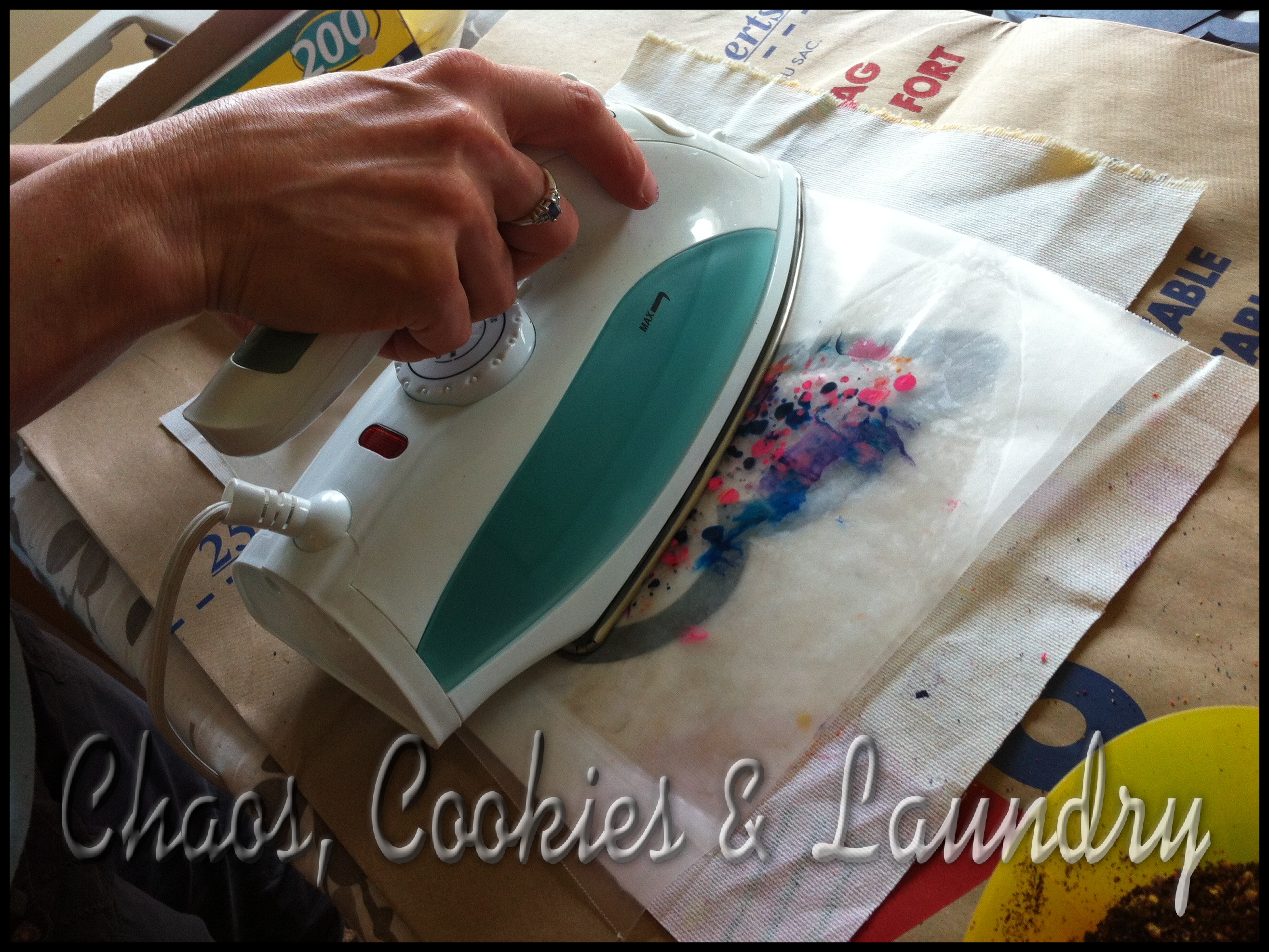 With a quick press from the hot iron the crayons melt and the colors blend together making a stained glass effect.