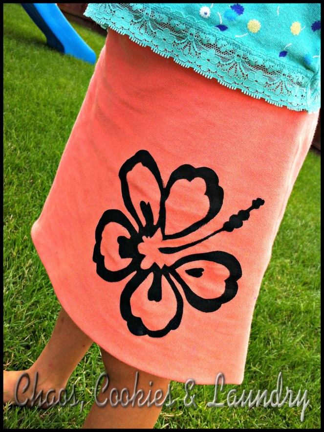 After putting the skirt together I added a cute Hibiscus flower to it. I outlined the image on fusible web, then ironed it to black broad cloth. With the image on the back of the fusible web it is really easy to cut out intricate shapes. The paper peels off the back and it is really easy to adhere to the skirt. Essentially fusible web makes most any fabric into an iron-on in any shape you want! I love that stuff. One year my MIL got me an entire bolt of it for Christmas. I was over the moon excited about that gift…
